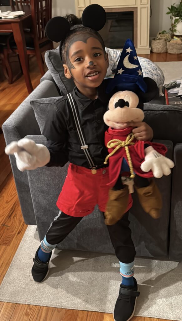 Now, decades later, I’m sitting at Theo’s tiny table (ouch, knees and back) watching my son live the same joy I once wished for. His dad helped put on his coat, and Theo walked to the door, confident and hype, ready to show the world his Mickey Mouse self. I stood there, smiling, realizing what a big deal that was for both of us.